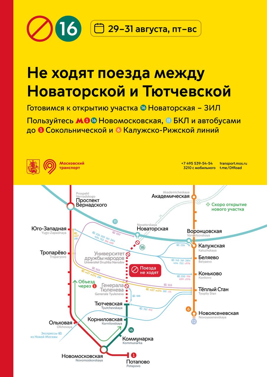 С 29 по 31 августа не будет движения между станциями «Тютчевская» и «Новаторская»