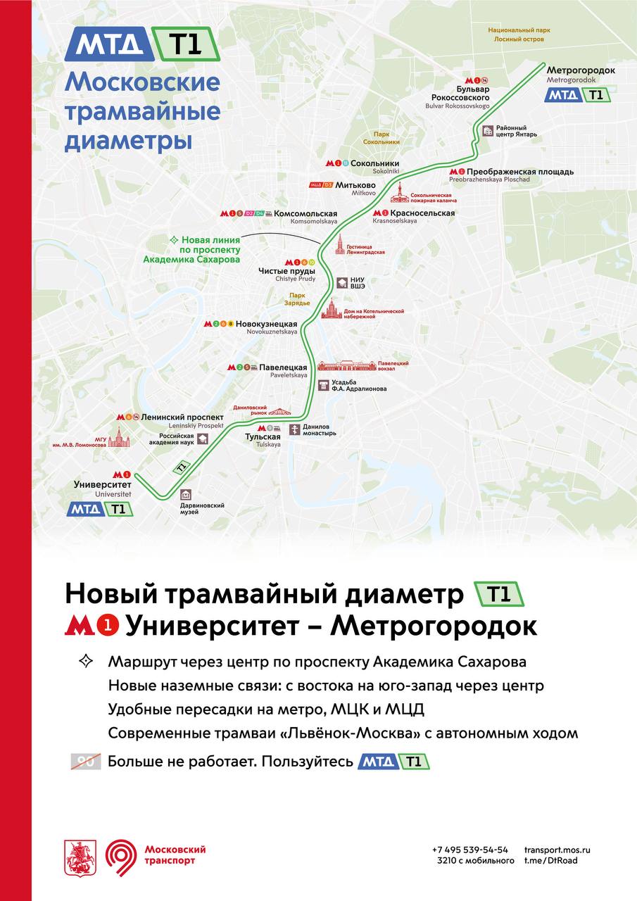 Т1 открывает город и соединяет всё: 13 районов Москвы с востока на юго-запад, 4 центральных ж/д вокзала и 24 станции метро, МЦК и МЦД.